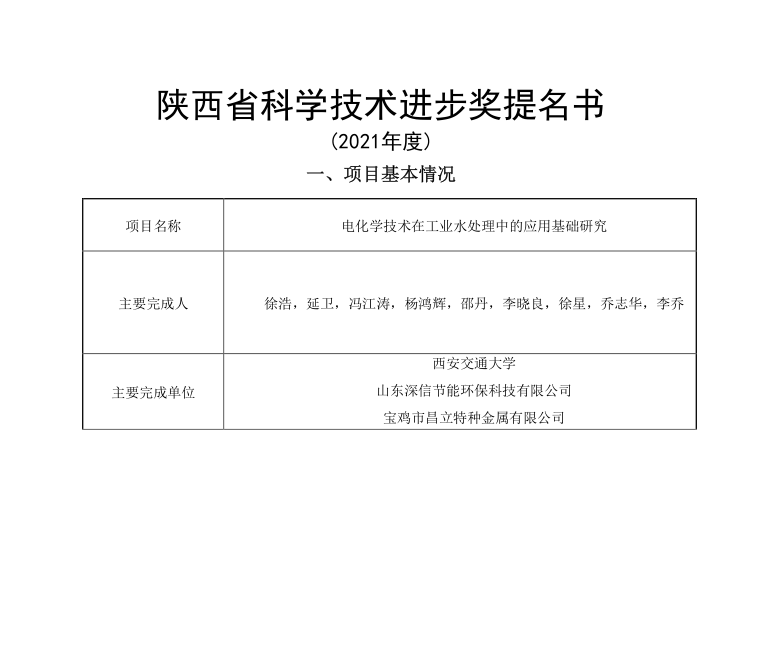 根據陜西省科技獎勵有關要求,現將我司2020年度陜西省科技獎合作申報項目 “電化學技術在工業水處理中的應用基礎研究”信息在公司主頁(http://m.tjsnydrygs.cn/)上公布,向全校征詢異議。