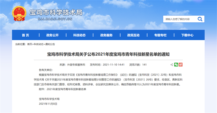寶雞市科學(xué)技術(shù)局開(kāi)展2021年度寶雞市青年科技新星培育計(jì)劃推薦工作旨在深入實(shí)施創(chuàng)新驅(qū)動(dòng)發(fā)展戰(zhàn)略,加快促進(jìn)科技、金融、產(chǎn)業(yè)、人才有機(jī)結(jié)合,培育我市高質(zhì)量發(fā)展急需的優(yōu)秀青年科技人才隊(duì)伍。