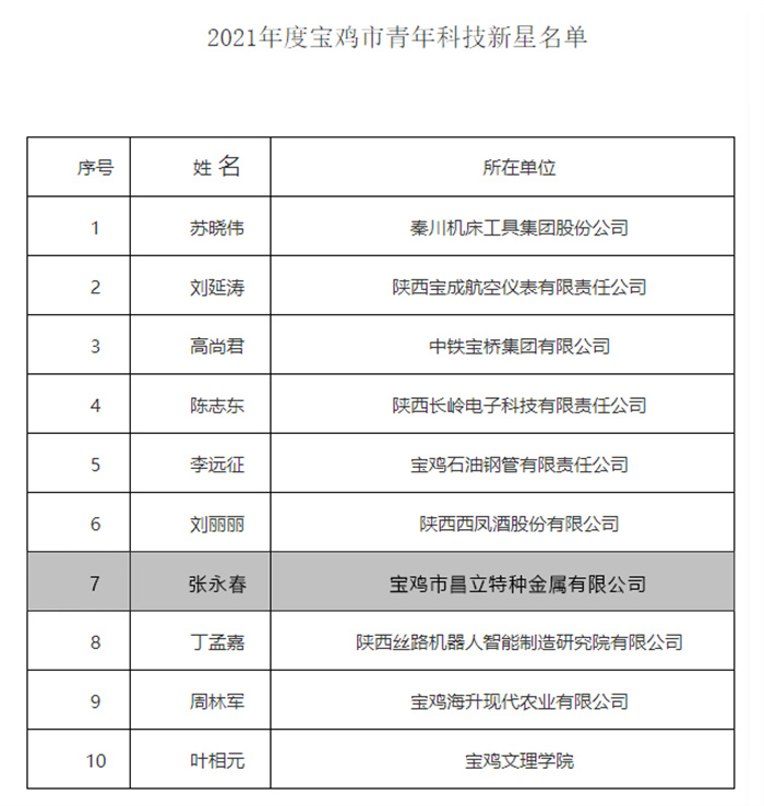近日,寶雞市科學(xué)技術(shù)局公布了2021年度寶雞市青年科技新星名單,我公司研發(fā)中心主任張永春成功入選!